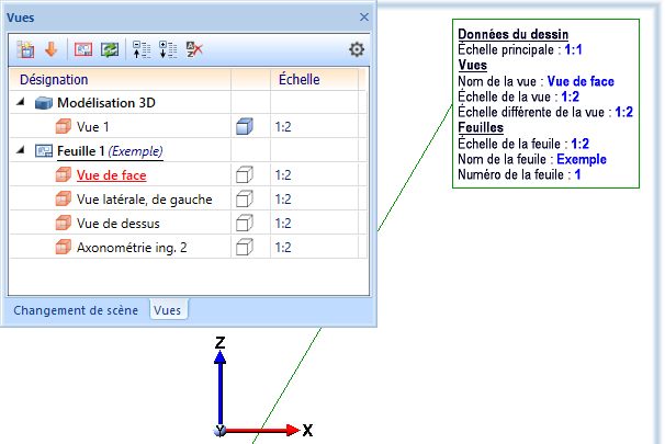 Une échelle différente de la vue n'existe que si l'échelle de la vue et l'échelle principale diffèrent. L'échelle de la feuille n'existe que si toutes les vues ont la même échelle sur la feuille. Ne sont pas prises en compte les vues de coupe/de détail, les vues de développement de tôle, ainsi que les axonométries dans les dessins d'exécution. Le nom de la feuille n'existe que si un nom a été attribué à la feuille