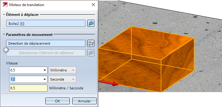(avec comme élément à déplacer Boite2, de déplacement : arête inférieure de la boîte (a), Vitesse : 6.5 mm/sec) :
