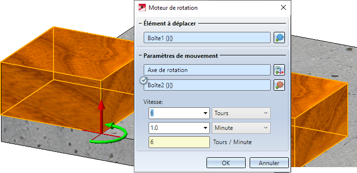 (avec comme élément à déplacer Boite1, l'axe de rotation est l'arête avant droite, Vitesse : 6 tours/min, Élément de référence Boite2) :