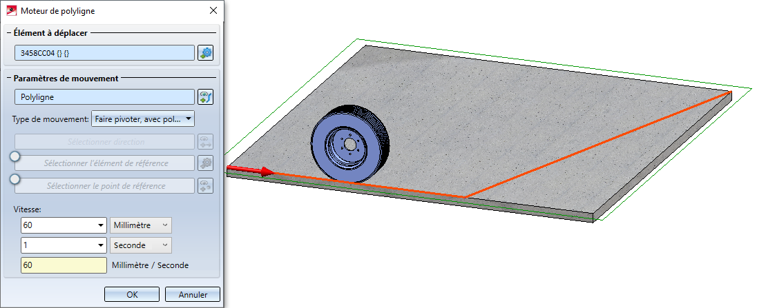 (avec comme élément à déplacer la roue, la polyligne est l'esquisse surlignée en bleu, Direction : Polyligne, Type de mouvement : Faire pivoter, avec polyligne, sans point de référence, Vitesse : 60 mm/sec).