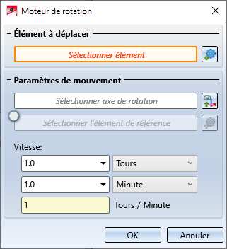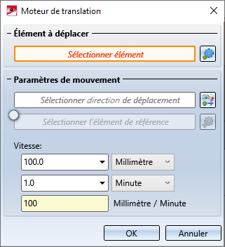 Pour modifier les paramètres d'un moteur, effectuez un double-clic sur le nom du moteur dans l'arborescence de la simulation. La fenêtre de dialogue correspondante s'ouvre alors. L'élément, ainsi que - selon le type de moteur choisi - le sens de déplacement, l'axe de rotation ou la polyligne seront alors surlignés en couleur sur la scène.