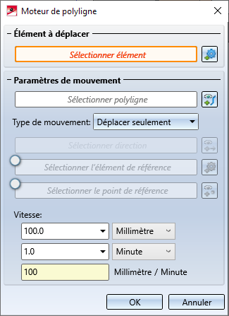 La définition d'un moteur de polyligne est similaire à celle d'un moteur de translation. Au lieu d'une direction de déplacement, c'est une polyligne qui sera ici identifiée. Vous pouvez en plus sélectionner ici un type de mouvement - comme dans la fonction Sweep de chaîne d'arêtes - ainsi qu'un point de référence. Types de mouvement