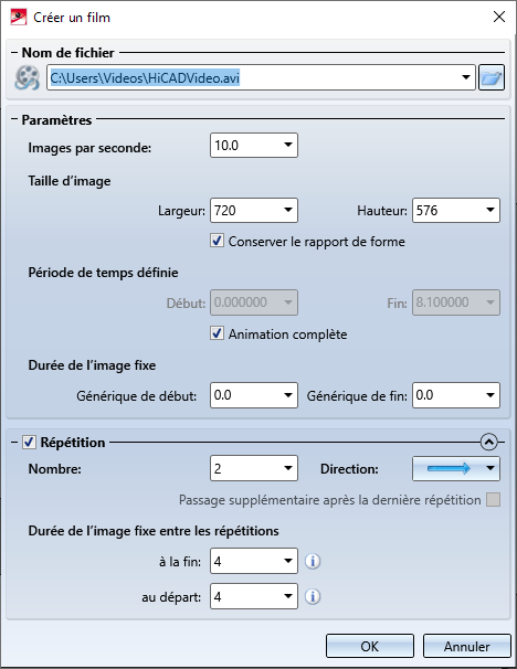 6. En cochant la case Répétition, d'autres options deviennent disponibles. Vous pouvez ici spécifier combien de fois la durée d'une séquence devra être répétée dans le film. Vous disposez pour cela des sens de visionnage possible :