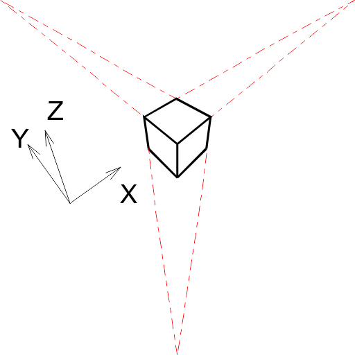 Deux axes de coordonnées sont parallèles au plan de l'image et sont donc projetés en parallèle sur le plan de l'image. Seul le troisième axe converge vers un point de fuite.