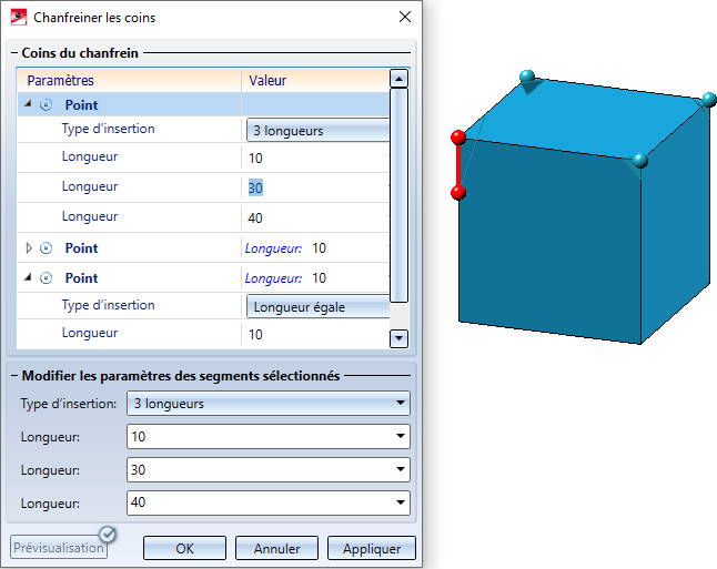 Tous les coins sélectionnés seront chanfreinés par un clic sur OK en fonction des valeurs indiquées sous Modifier les paramètres des segments sélectionnés.