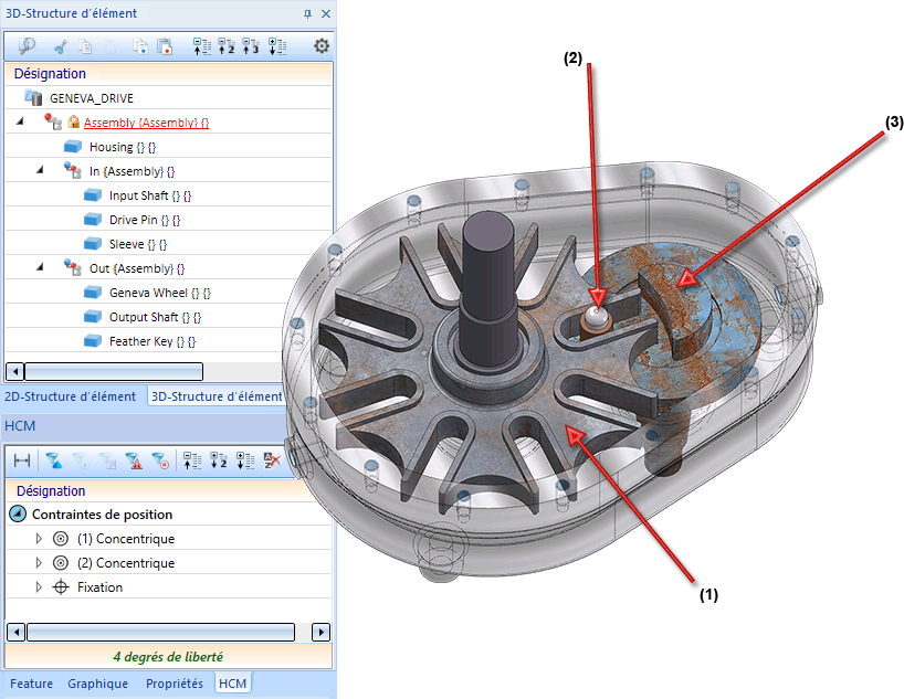 L'exemple utilise un mécanisme à croix de Malte. Les éléments de l'ensemble sont reliés entre eux par des contraintes HCM (cf. GENEVA_DRIVE.SZA). Un matériau aura été attribué aux éléments de l'ensemble.