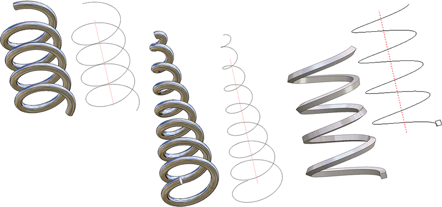 L'illustration suivante montre des spirales qui ont été utilisées comme lignes directrices dans la fonction Sweep de chaîne d'arêtes pour la pose d'une coupe transversale circulaire (esquisse rectangulaire).