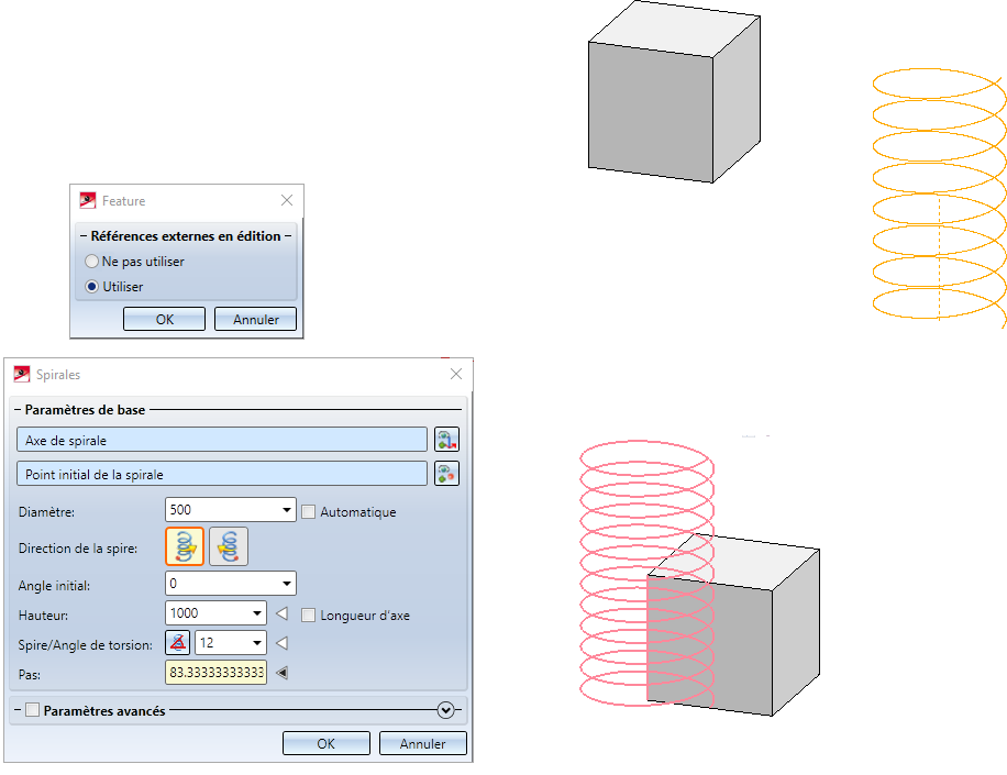 Pour les spirales également, le paramètre de Feature Références externes en édition est pris en compte. Sur la base de ce paramètre, le comportement concernant les références externes sera ajusté en conséquence.