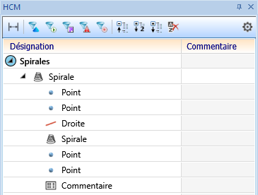 Par ailleurs, il existe également, pour les points de début des segments, le point de fin du segment de fin, le point de départ et de fin de l'axe de la spirale, une entrée propre Point. L'axe de la spirale même est représenté par l'entrée Droite. Les segments de début et de fin sont représentés chacun par une entrée HCM Point pour la fin du segment de début et pour le début du segment de fin.