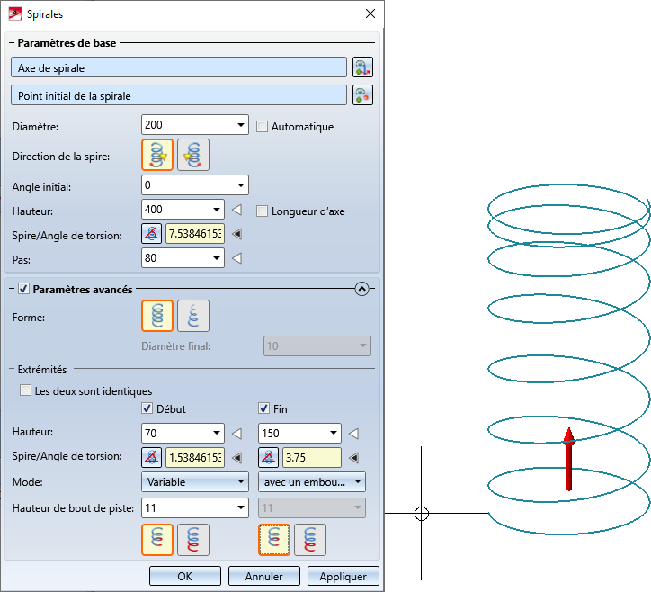 Par un clic sur le symbole , vous pouvez accéder à la partie basse de la fenêtre (par défaut, cet encart est fermé). Vous y avez la possibilité, en cochant la case Paramètres avancés, de définir d'autres paramètres. À titre d'exemple, vous pouvez choisir entre une forme de spirale cylindrique ou conique et spécifier un tracé différent au début et à la fin de la spirale.