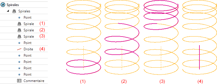 L'illustration suivante montre une spirale de forme conique avec diverses modifications au début et à la fin :