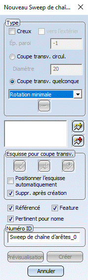 Lancez la fonction, soit en passant par la barre de menu, soit par le menu contextuel pour les éléments. La fenêtre Nouveau Sweep de chaînes d'arêtes s'ouvrira.