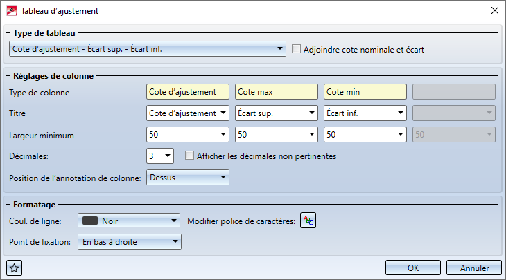 Cotation+Annotation 3D > Outils > Extras > Paramètres Tableau d'ajustement