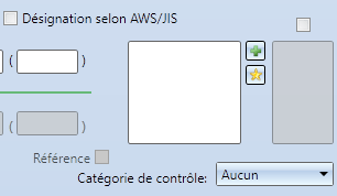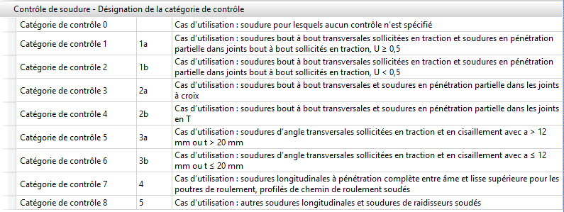Dans la liste Catégorie de contrôle, vous pouvez sélectionner la méthode de vérification/contrôle d'après DIN EN 1090. Ces catégories de contrôle sont prédéfinies dans le Gestionnaire de Configuration sous Modélisation > Soudures. Elles sont évaluées lors de la création de protocoles de contrôle de soudure.