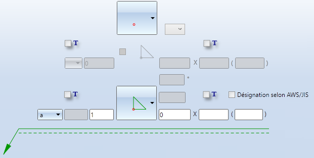Dans cette section, définissez la représentation symbolique pour le côté de référence. Choisissez le symbole de soudure souhaité. Selon le choix que vous aurez fait, d'autres champs de saisies et champs de sélection de symboles s'activeront. Par exemple, le type précis d'une soudure d'angle (plat, convexe, etc.) peut être spécifié.