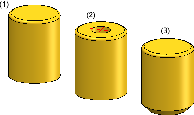 Lorsque l'on utilise la fonction Enregistrer l'élément référencé sur le 2e cylindre, il sera enregistré directement. À la prochaine actualisation de la scène, le chanfreinage est perdu. Si l'on avait utilisé la fonction sur le 3e cylindre, il sera également enregistré directement. À l'actualisation de la scène, le perçage est perdu. Si l'on avait, par contre, utilisé la fonction sur le 1er cylindre, HiCAD constatera que celui-ci n'a pas été modifié et recherchera les éléments identiques modifiés. Le 2e cylindre aura été, selon notre exemple, trouvé par HiCAD.