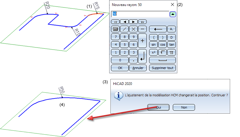 Vous pouvez alors, en cliquant sur Non, renoncer à l'ajustement du rayon ou, en cliquant sur Oui, confirmer la modification du rayon ce qui entraînera d'autres modifications de la géométrie par l'HCM.
