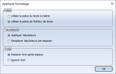 Vous pouvez également reprendre des tirets, des tabulations, des listes à puces et des listes numérotées de textes originaux. Les textes qui ont été séparés par des tabulations seront disposés en colonnes lors de leur reprise. Il peut donc être judicieux de remplacer dans les listes les tabulations par des espaces. Vous pouvez spécifier les paramètres de reprise des textes dans la fenêtre de dialogue Appliquer formatage qui s'ouvre automatiquement.
