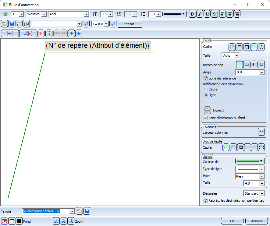 Si cette case est cochée, l'annotation sera alors créée avec une ligne de référence. Dans ce cas, vous pouvez spécifier dans l'encart Lignes la représentation de la ligne de référence. Il s'agit de la couleur de la ligne, du type de ligne et du point d'attache, c'est-à-dire le symbole de la ligne de référence.