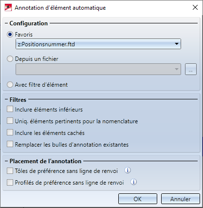 Les paramètres se trouvent dans le Gestionnaire de Configuration sous Dessin > Annotations > Annotation automatique > Favoris. Vous pouvez également y prédéfinir le fichier-modèle pour l'annotation automatique. Celui-ci sera affiché par défaut au lancement de la fonction Annotation d'élément automatique dans le champ Favoris.