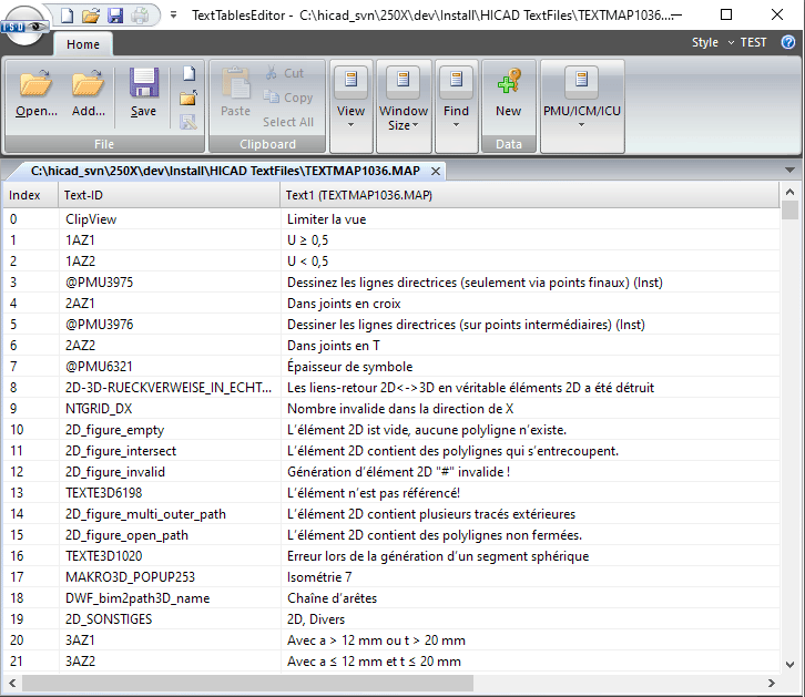 Les ID de texte issus du service de texte de HiCAD (comme montré dans l'éditeur TEXTTABLESEDITOR.EXE) peuvent être utilisés dans les bulles d'annotation. Cela n'aura cependant pas lieu dans l'éditeur d'annotation, mais doit être paramétré dans les fichiers-modèles (FTD) correspondants :