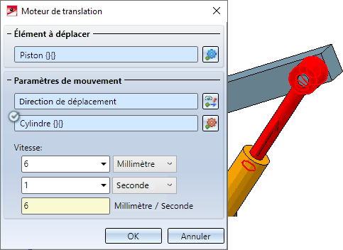L'illustration montre une plate-forme en ciseaux. Les éléments de l'ensemble sont reliés entre eux par des contraintes HCM (cf. SCHERENHUBTISCH.SZA). Ici, le piston doit être mis en mouvement. Grâce aux contraintes HCM, les autres éléments de l'ensemble subiront un déplacement en conséquence. Le mouvement en question va de bas en haut.
