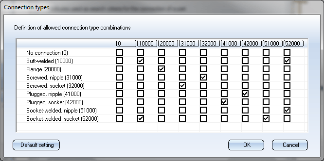 Here you can specify the allowed combinations of connection types which should apply when connecting two parts. This will be taken as a basis for the automatic determination of the search criteria for the connection type attributes of the part to be connected (the insertion of a straight pipe will always be interpreted as a "connecting" to the parts between which it is placed).