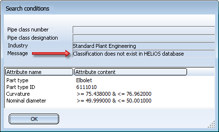 When fitting a straight pipe between two already existing parts, the connections of the parts will supply two sets of search criteria. If an attribute exists in both sets, but has different values, the fitting of the pipe is not possible.