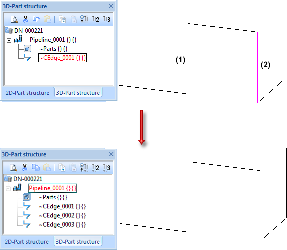 If edges (1) and (2) are deleted in the displayed guideline, three separate guideline parts will emerge.