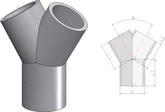 In both cases, the inserted pipe leads tangentially out of the thicker pipe, with the pipe placed as close to the edge of the thicker pipe as its wall thickness allows. In the following figure, this is indicated by the red line: