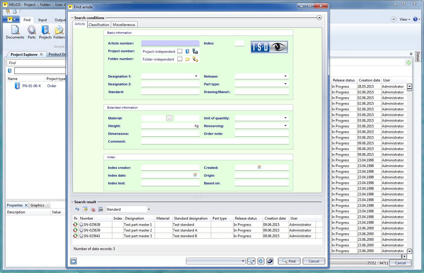 First, start the HELiOS Desktop and create, via a targeted article search with suitable search criteria, a result list containing the article masters that you want to use for the part variant. Please leave this window open, as you will need it again later.