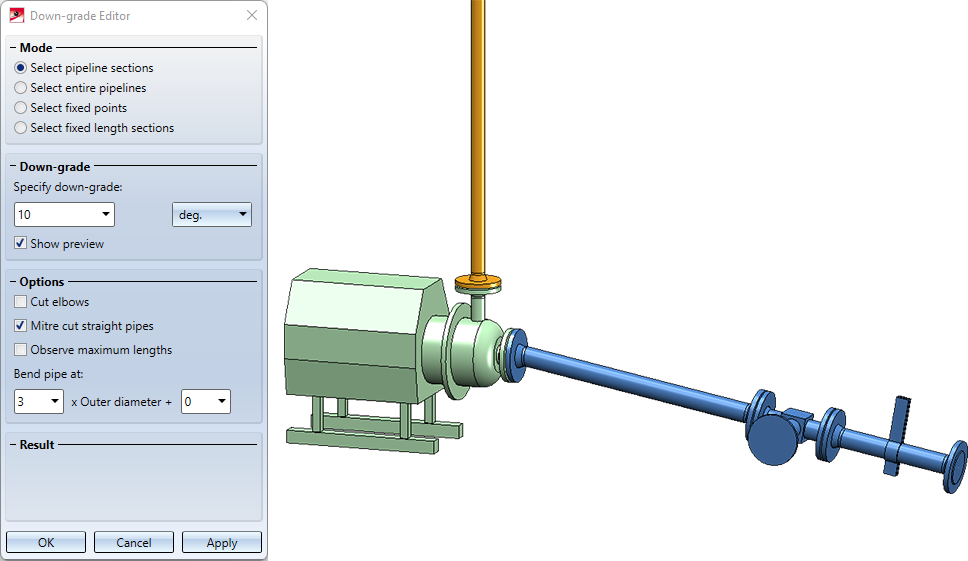 Use the Down-grade Editor to assign down-grades to individual sections of a pipeline. You find the Down-grade Editor at Plant Engineering > Pipeline Tools > Change