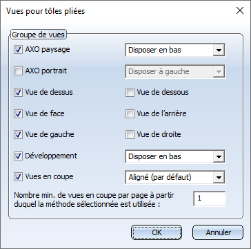 - Pour les tôles pliées, il est encore possible de représenter des projections développées (développements) et des vues en coupe. Il faut alors simplement cocher les cases correspondantes :