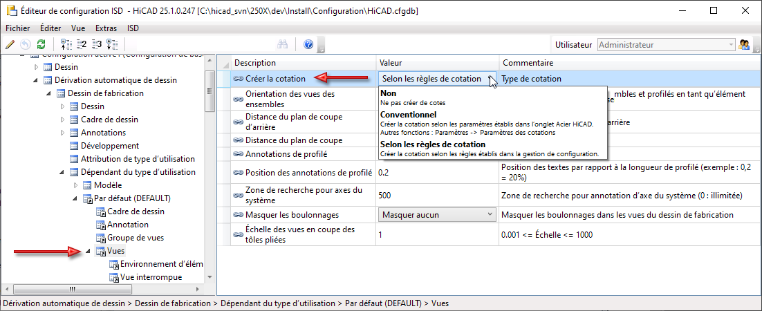 Si le paramètre est sur conventionnel, ce ne sera donc pas les paramètres dans le Gestionnaire de Configuration qui seront utilisés pour chaque type d'utilisation, mais les paramètres de cotation conventionnels issus du fichier STW_DimSettings.XML stocké dans le répertoire sys de HiCAD.