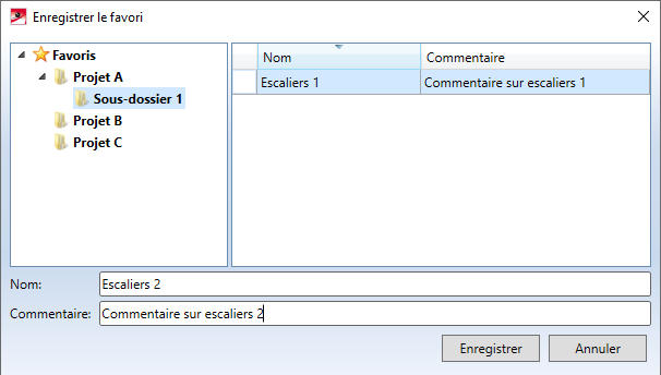 Veuillez noter que les favoris appartiennent toujours à une boîte de dialogue. C'est pourquoi, lorsque vous activez par exemple la gestion des favoris dans la boîte de dialogue du configurateur d'escaliers, seuls les favoris relatifs au configurateur d'escaliers vous seront alors affichés.