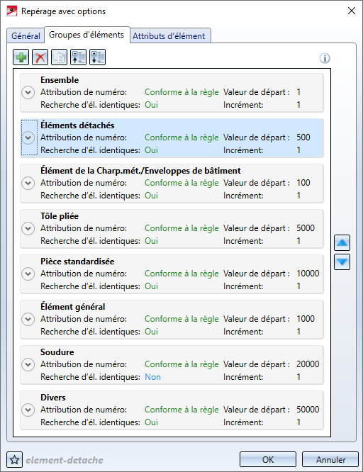 Vous devez donc, dans les paramètres du repérage sous Groupes d'éléments, créer un groupe correspondant aux éléments détachés et sauvegarder ces paramètres modifiés dans un nouveau fichier favori. Pour que les paramètres de ce fichier soient pris en compte lors du repérage automatique, soit vous modifiez le paramètre dans le Gestionnaire de Configuration sous Paramètres système > Repérage > Paramètres par défaut, soit vous sélectionnez le nouveau fichier favori dans les options du repérage.