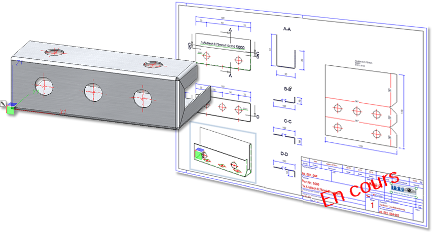 Pour la mise en plan et le dessin de fabrication, il est absolument nécessaire de disposer des dérivations de dessins (dessins d'exécution) avec développement, coupe de tôle et vue 3D. La création/gestion automatisée de ces documents importants s'effectue dans HiCAD via l'onglet Gestion de dessin, groupe de fonctions Atelier, fonction Dessin. Vous pouvez y créer des dessins d'exécution de tôles pliées de manière analogue au dessin d'exécution de la Charpente métallique .