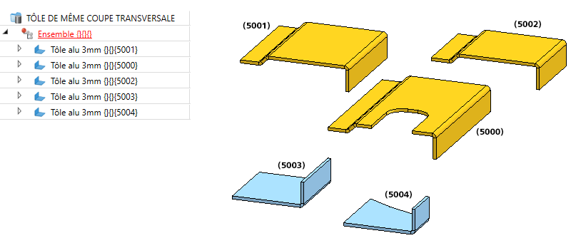 La scène présentée ci-dessous contient 5 tôles d'aluminium. Par ailleurs, les tôles 5001 et 5002 possèdent des profondeurs différentes, pour autant elles ont une coupe transversale identique et ne sont pas usinées. Pour la tôle 5000, il en va autrement, puisque cette tôle possède une découpe, elle a donc été usinée. De même pour la tôle 5003 non usinée et la tôle 5004 usinée en raison de la découpe.