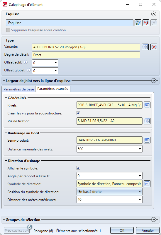 - Si, lors de la Configuration des arêtes, vous avez sélectionné dans l'onglet Paramètres de base l'option Profilé de raidissage, le type de profilé et la distance maximale des rivets pourront être paramétrés ici.