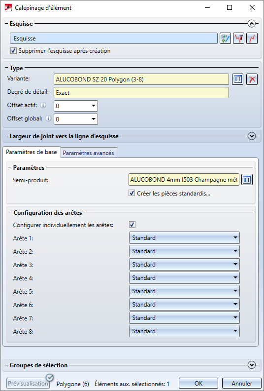 Cette variante permet de poser des cassettes ALUCOBOND® SZ 20 sur des polygones de 3 à 8 côtés. Il est à noter ici que, à la différence de la variante Cassette ALUCOBOND® SZ 20 (avec accessoires), vous pouvez ici configurer individuellement comment devront être usinés chacune des arêtes de la surface de calepinage, à quels endroits devront être créés des profilés en S et en Z lors du calepinage.