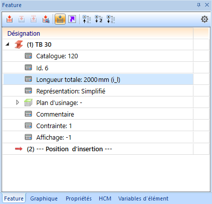 - Déployez l'arborescence dans l'ICN à l'onglet Feature l'entrée de Feature TB 30 et double-cliquez sur l'entrée Longueur totale. Indiquez comme nouvelle valeur