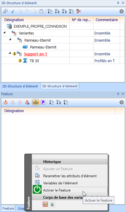 - Sélectionnez l'ensemble Support-en-T. Celui-ci ne possède encore aucun historique de Feature, c'est pourquoi il vous faut l'activer : cliquez ici avec le bouton droit de la souris dans la zone vide de la fenêtre de l'onglet Feature dans l'ICN et sélectionnez la fonction Activer le Feature.