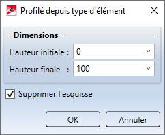 Créer un élément via catalogue de type d'élément, en tant qu'él.princ. À l'aide de cette fonction, vous pouvez créer un élément principal à partir d'une esquisse en définissant un type d'élément, une hauteur initiale et finale. Après avoir sélectionné le type d'élément dans le catalogue, la fenêtre de dialogue ci-dessous s'affiche :