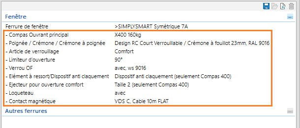 Les nouveaux attributs textuels transmissibles pour les ferrures sont composés également de plusieurs attributs LogiKal : si des ferrures sont présentes, dix attributs au total contiennent chacun un texte de description des ferrures d'un remplissage.