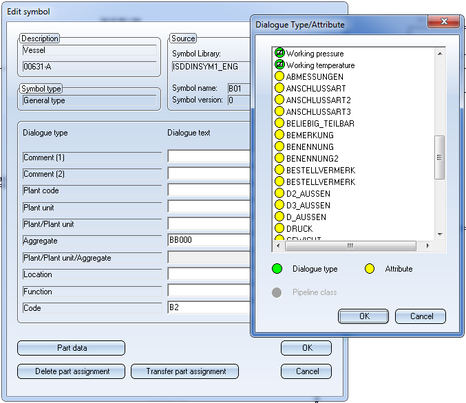 You can specify the assignment of a database attribute to a dialogue type in the data mask of a symbol already during its creation or its processing in the P+ID Symbol Editor. In this way you will achieve that the symbol, as soon as it has been inserted in the P+ID and has received a part assignment, will automatically adopt the attribute value that corresponds to the reference.