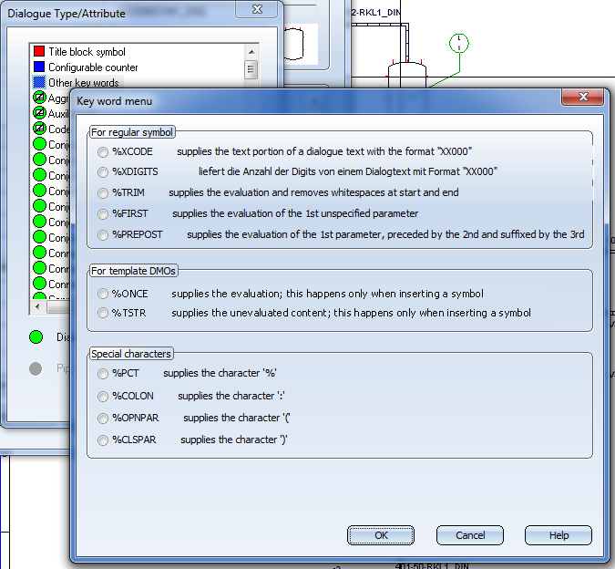After selecting the key word you can call the context menu function Dialogue type/Attribute in the displayed dialogue window. e.g. %TRIM(%PIDAT(3200)) |
