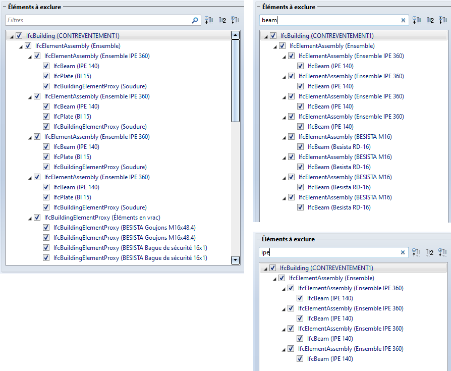 Vous pouvez en outre saisir une chaîne de caractères en haut de la fenêtre de dialogue, pour affiner le filtre d'importation. Il peut s'agir de n'importe quelle partie du nom de l'IFC ou du type d'IFC. Exemple : beam. L'arborescence est immédiatement adaptée. Si vous saisissez ensuite un autre terme, l'arborescence est encore filtrée.