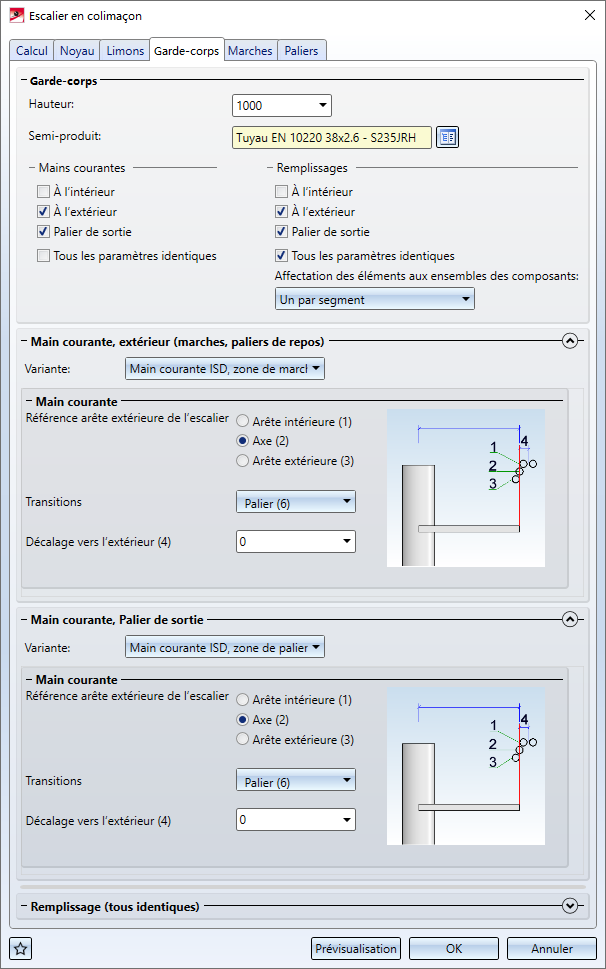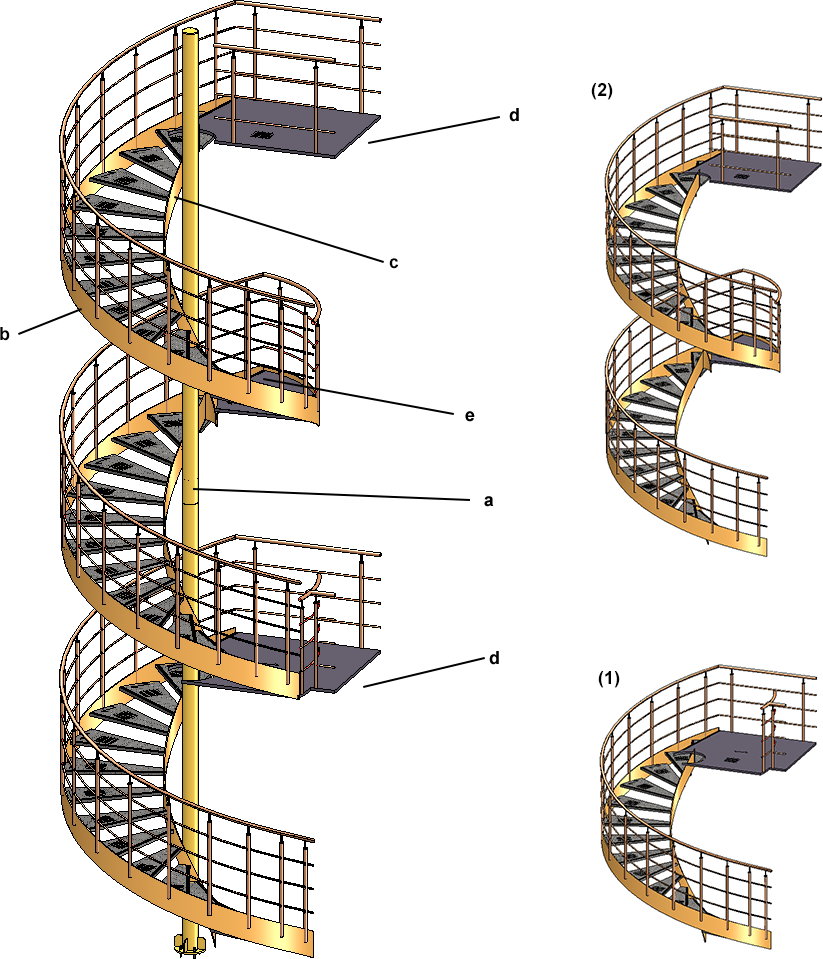 Ici sont définies les garde-corps, intérieur et extérieur, pour l'escalier en colimaçon, ainsi que les paliers de sortie et de repos.