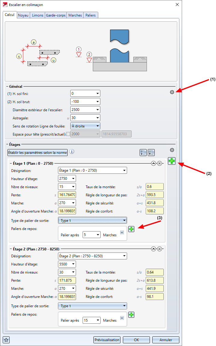Pour chaque étage, vous pouvez définir le type de palier de sortie et le nombre de paliers de repos. Pour ajouter d'autres paliers de repos, cliquez sur (3) et indiquez les données de votre choix.