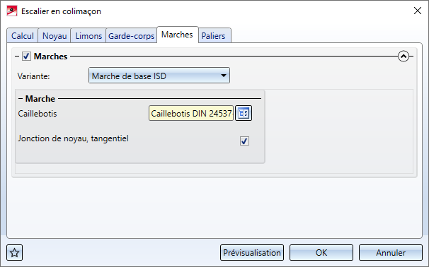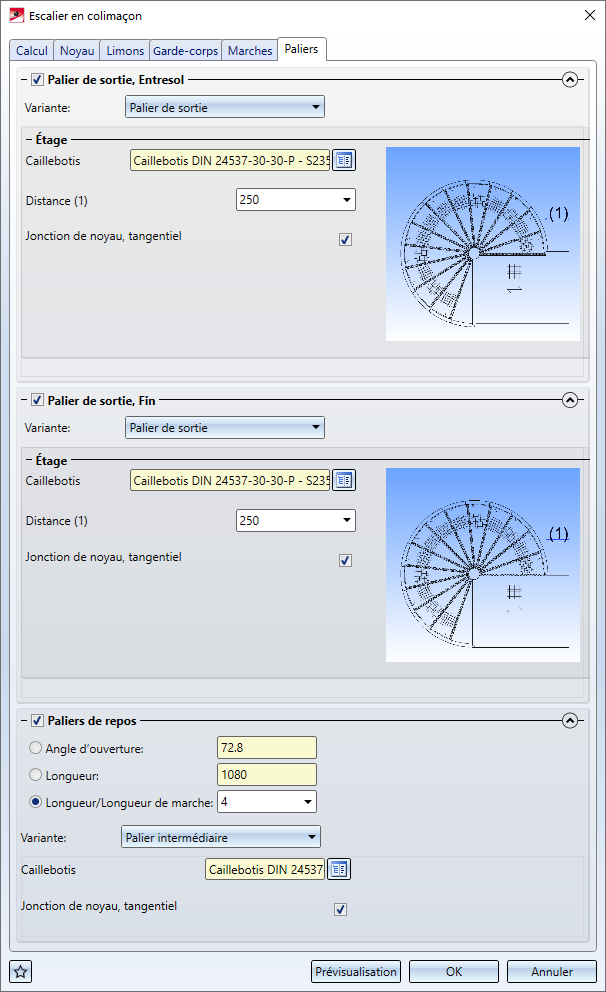 La fenêtre de dialogue Escalier en colimaçon se compose de six onglets :
